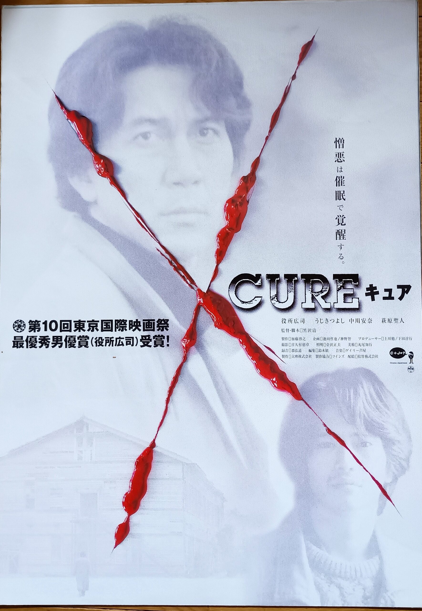 CUREキュア/脚本・監督:黒沢清。音楽:ゲイリー芦屋。役所広司主演。猟奇的殺人事件の犯人を追う刑事の姿を描いたサイコ・サスペンス。監督・脚本は「復讐 消えない傷痕」の黒沢清。撮影を「マネージャーの掟」の喜久村徳章が担当している。主演は役所広司、本作で第10回東京国際映画祭の主演男優賞を受賞。殺人事件が立て続けに発生。それぞれの事件の犯人につながりはないが、犠牲者の首から胸にかけてがX字型に切り裂かれていること、いずれの加害者も事件直後に犯行現場付近で逮捕されること、そして犯行の直前まで犯人に明確な殺意がなかったことが共通していた。やがて、一連の事件に関連のある人物として記憶喪失の放浪者、間宮が浮かび上がる。高部は間宮の記憶傷害による進展のない会話に翻弄され、また精神を病んだ妻・文江の介護による疲れも加わり、その苛立ちを積もらせていく。やがて、間宮が元医大の学生で、メスマーという18世紀の医者が開発した催眠療法の研究をしていたことを知った高部は、正式に調書を作ろうとするものの、間宮の不思議な話術のうちで妻の病気を指摘され、苛立ちを爆発させてしまった。そんな高部を間宮は誉め称え、高部こそ自分の言葉の本当の意味を理解できる人間だと語る。疲れきった高部は文江を病院へ入院させた。高部の精神状態に危機感を抱いた佐久間は、間宮に深入りしないよう忠告するが、自らも間宮と催眠療法の施術に取り憑かれていく。やがて、精神病院に収監されていた間宮が脱走した。時を同じくして、佐久間が奇妙な状態の自殺死体として発見される。高部は、本当の自分に出会いたい人間は必ずここにやって来ると間宮が言う、森の中の廃屋で間宮と再会し、そして彼を殺害した。すべては終わったかのように思われたが、病院では文江がX字に切り裂かれて殺され、高部のいるレストランでは、ウエイトレスが店長に包丁を向けていた。1997年12月27日公開、松竹ピカデリー。【サイズ:B2ポスター】【年代:1997年】