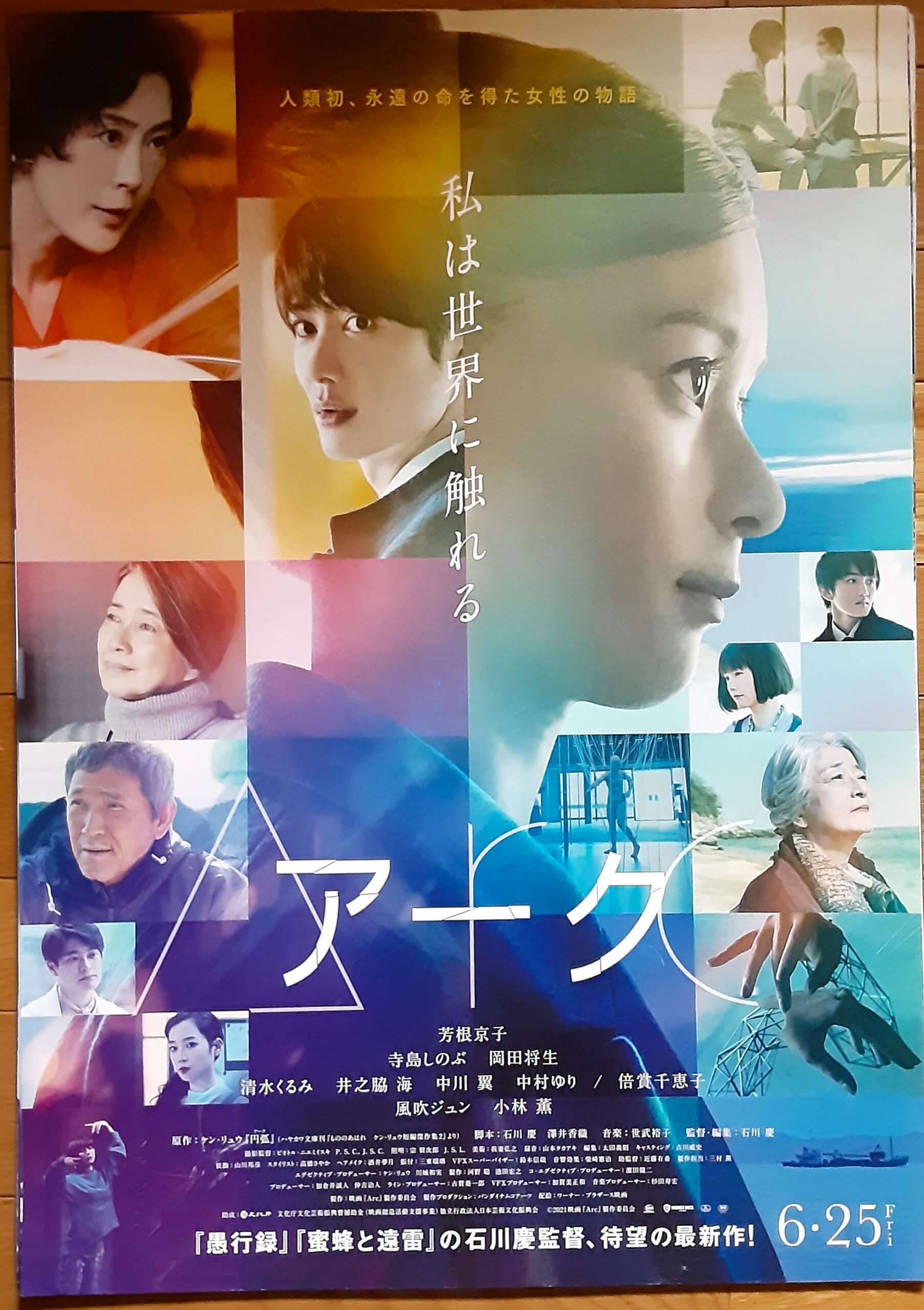Arcアーク/原作:ケン・リュウ「円弧アーク」。脚本:澤井香織。脚本・編集・監督:石川慶。音楽:世武裕子。豊橋出身の石川慶監督がSF作家ケン・リュウの短編集「もののあはれ」所収の「円弧(アーク)」を実写映画化したSF。不老不死が現実となった近未来を舞台に、人類で初めて永遠の命を得た女性をめぐる物語が展開する。主人公を『累 -かさね-』などの芳根京子が演じ、『キャタピラー』などの寺島しのぶ、『さんかく窓の外側は夜』などの岡田将生のほか、倍賞千恵子、風吹ジュン、小林薫らが共演する豪華版。配給はワーナーブラザーズ。近未来、放浪生活を送っていたリナ(芳根京子)は人生の師となるエマ(寺島しのぶ)と出会い、遺体を生前の姿のまま保存できるように施術(プラスティネーション)する「ボディワークス」という仕事に就く。一方、エマの弟で科学者の天音(岡田将生)は、この技術を発展させた不老不死の研究に打ち込んでいた。30歳になったリナは不老不死の処置を受け、人類で初めて永遠の命を得る。やがて、永遠の生が普通となった世界は人類を二分し、混乱と変化をもたらしていく。登場する女性たちは男性に選択肢を委ねることなく、悩みながらも自分の意思で歩む強さを持っているイメージ。国内興行は芳しくなかった127分。2021年6月25日公開、ユナイテッドシネマ豊橋18。2022年第20回とよはしまちなかスロータウン映画祭、石川慶監督ゲストでシネマトーク時に上映。【サイズ:B2ポスター】【年代:2021年】